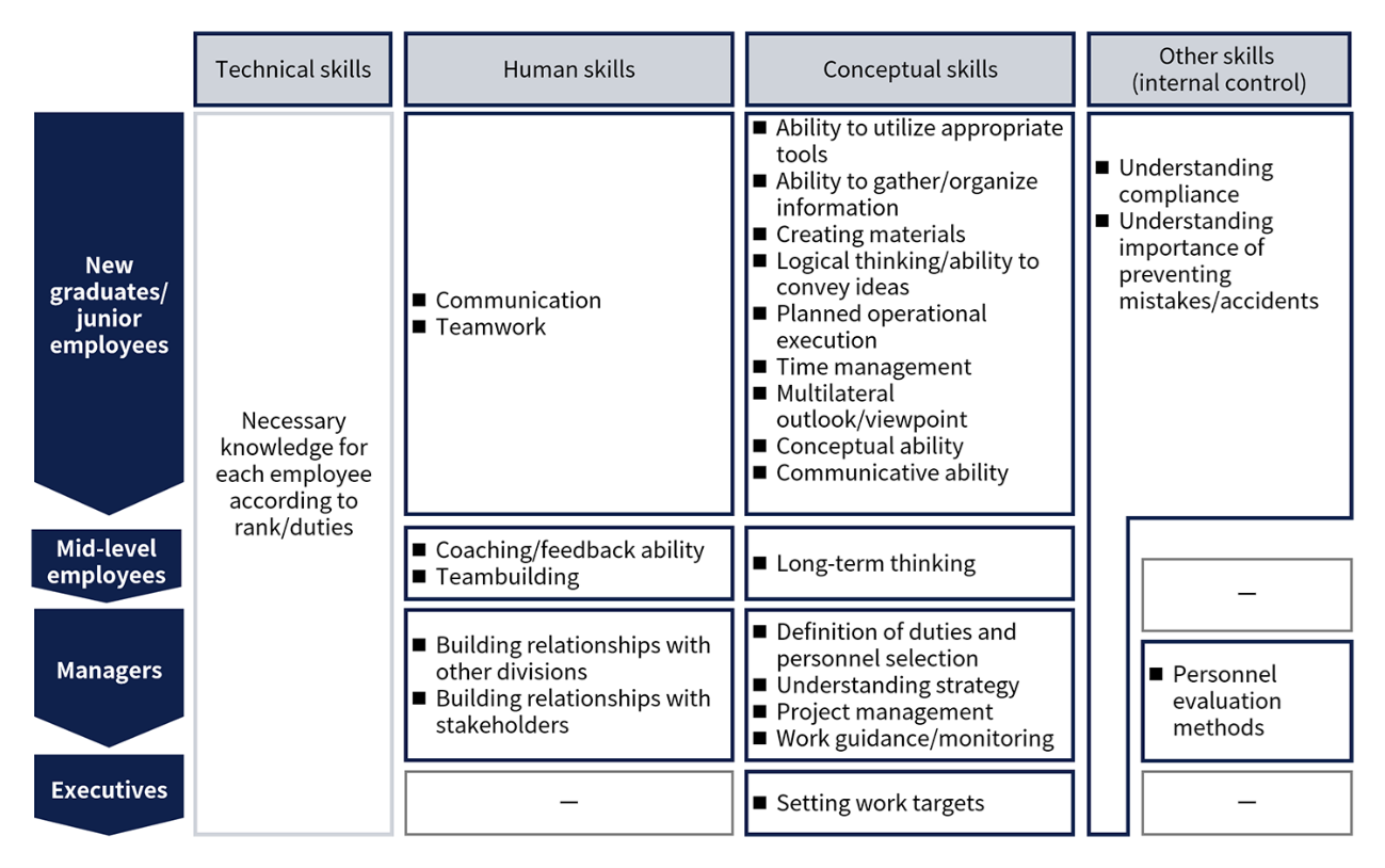 At our company, in order to be able to secure the appropriate human resources at the appropriate times and in line with changes in the business situation, environment, etc., in addition to undertaking new recruitment on an ongoing basis, we are promoting the development of various skills for employees via the education and training programs mentioned below.